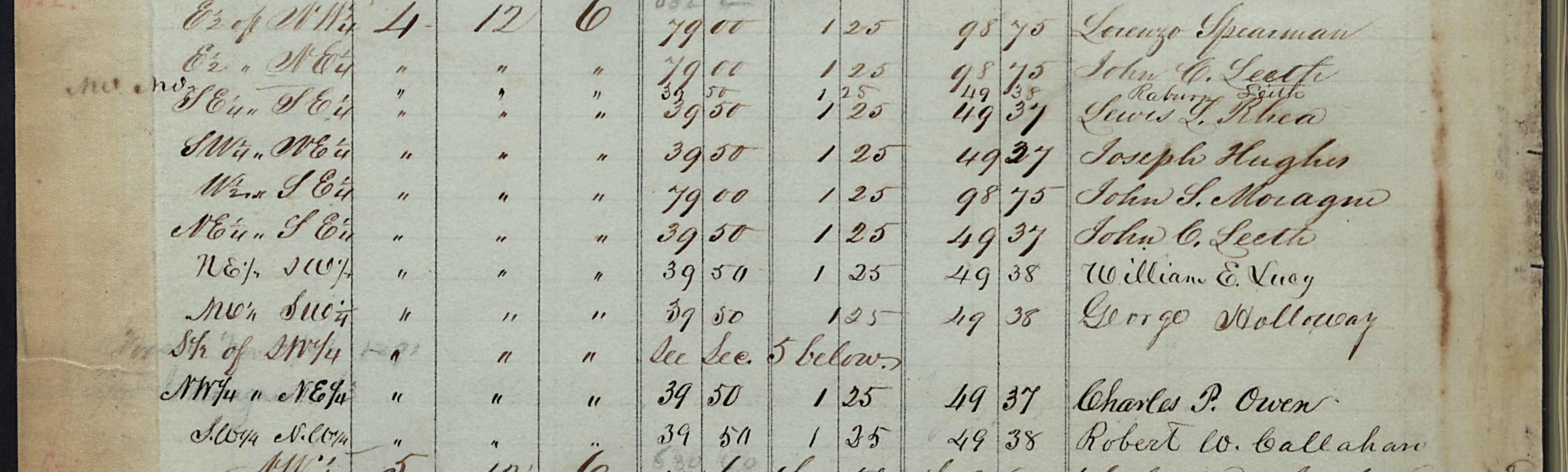9. 86. Bureau of Land Management, General Land Office Records, Eastern States Office, Springfield, VA. Pre-emption Certificate #6,072 for James S. Leeth of Cherokee County Alabama issued May 1, 1845 for fractions “A” and “B” of fractional Section 3 in Township 12 of Range 6 East. Pre-emption Certificate #6,359 for William Boyd of Benton County Alabama issued May 1, 1846 for fraction “C” and the south part of the southeast quarter of fractional Section 3 of Township 12 in Range 6. Pre-emption Certificate #6,811 for William Tillison and Francis M. Tillison, assignees of Thomas Hollingsworth (as tenants in common) issued June 1, 1845 for the northwest fractional quarter and the fraction “D” of fractional Section 3 in the fractional Township 12 of Range 6 East. All in the District of Lands subject to Sale at Lebanon Alabama. http://www.glorecords.blm.gov/PatentSearch/ ↩︎