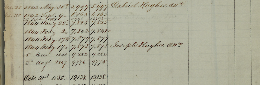 Here is a listing of the patent purchasers who homesteaded the property that would become Gadsden, Alabama, in the 1840s. You can see Joseph Hughes, John S. Morgan, and Lewis L. Rhea in the center.
