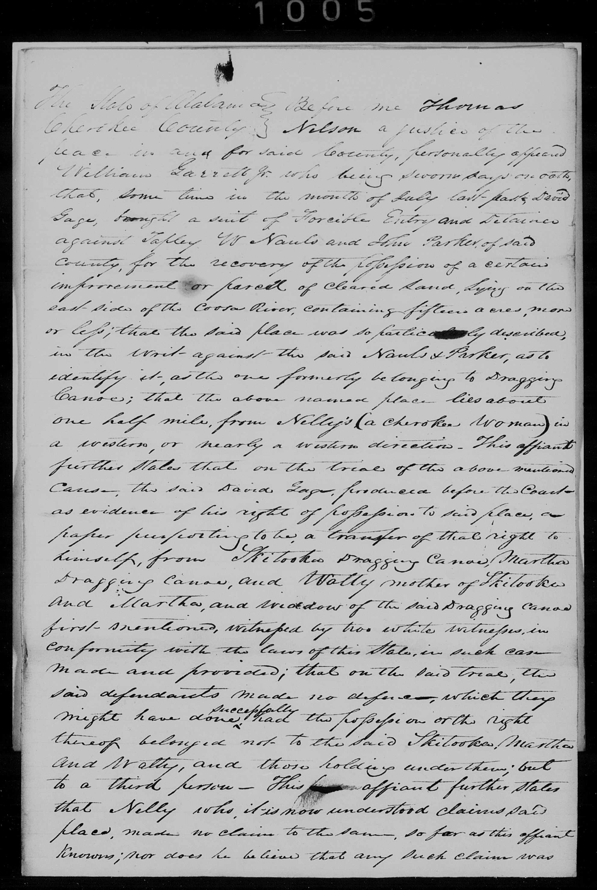 “James Lasley the husband was a Whiteman, a citizen of the United States, resided with his wife & children on their improvement, until about the year 1822 or 1823, when he abruptly deserted his wife Elizabeth Lasley & infant children . . . went to Turkey town, took up with another Indian woman, drove off her husband continued to live with that other woman, with a view to get the reservation at or near Turkey town.”