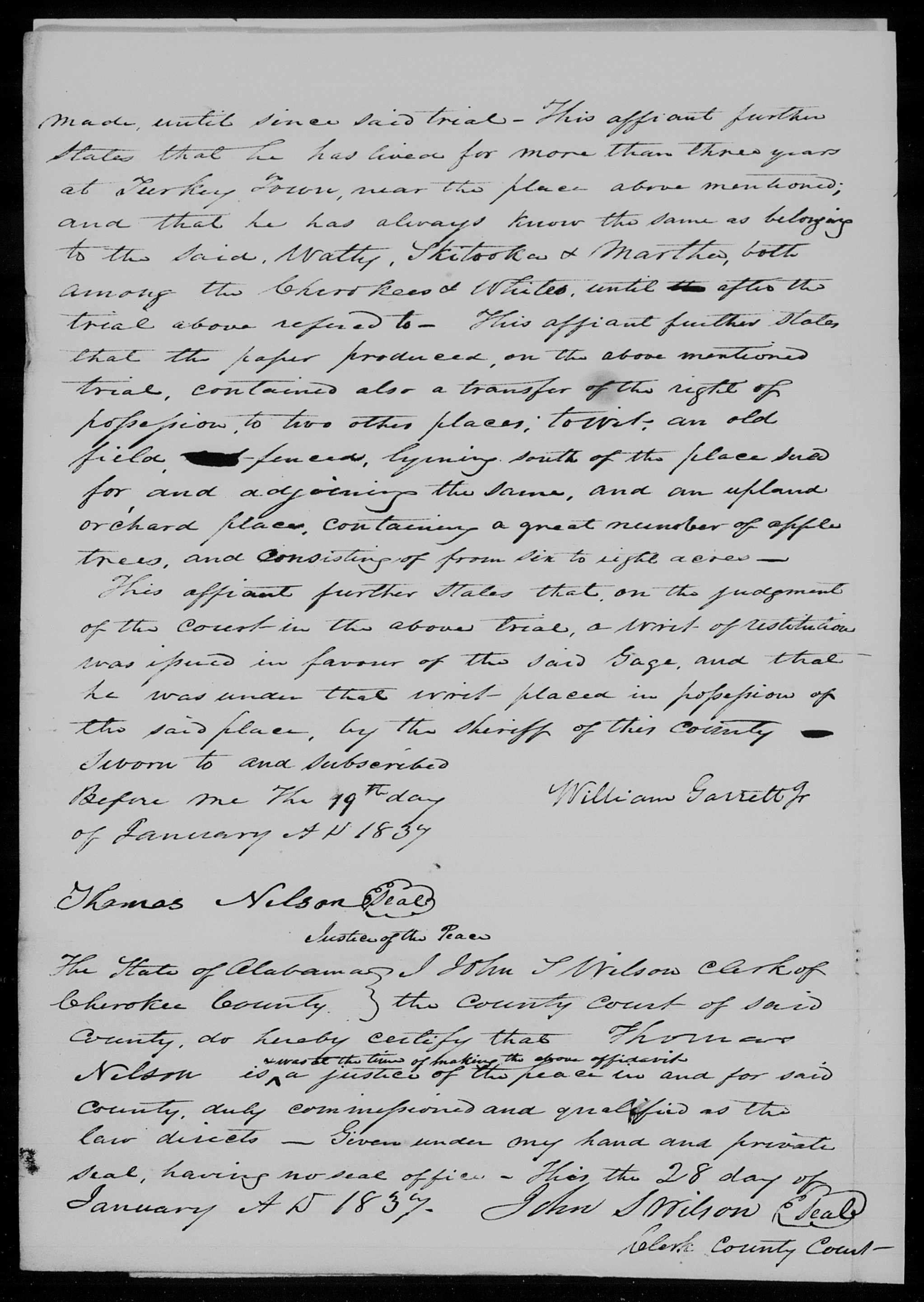 4. 81 John Riley’s Claim dated December 17, 1836. Folder of John Riley; Miscellaneous Claims Papers, 1836-1839, of the First Board of Cherokee Commissioners, Entry 236; Records of the Bureau of Indian Affairs, Record Group 75; National Archives Building, Washington DC. The Folder of also contains an affidavit dated October 7, 1837 from George W. Walker affirming Riley’s Claim. It is not known what George Walker’s relationship was to William B. Walker. The Folder also contains a statement from Hezekiah Oden dated December 11, 1837 that refers to Walker as Capt. William B. Walker. See also St Clair County Court Minutes Book (1828-1834) page 190 where during the August 1832 Term it is recorded “Ordered by the Court that William B. Walker be authorized to Establish a ferry on Coosa river at his residence at the following rates….”  ↩︎
