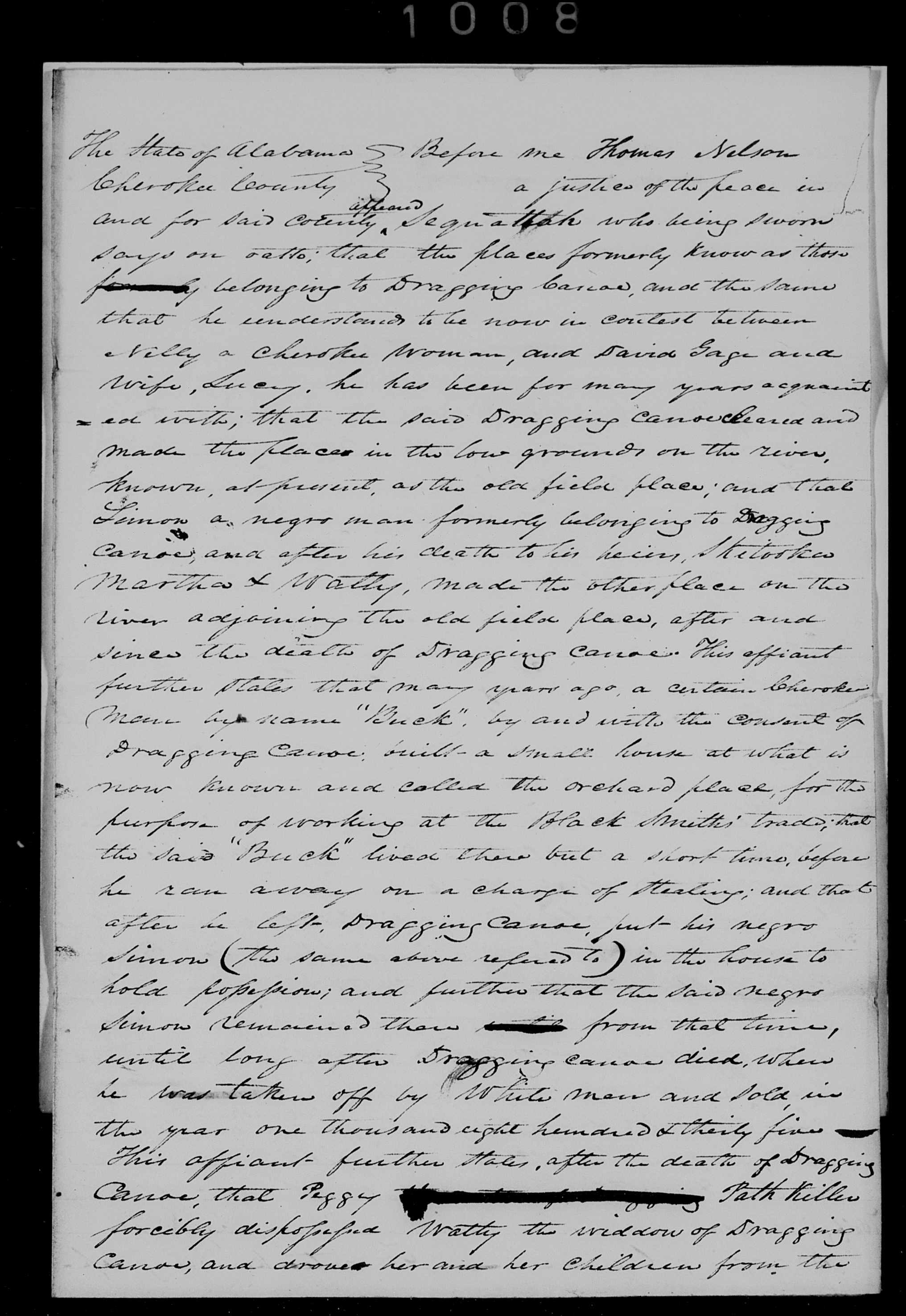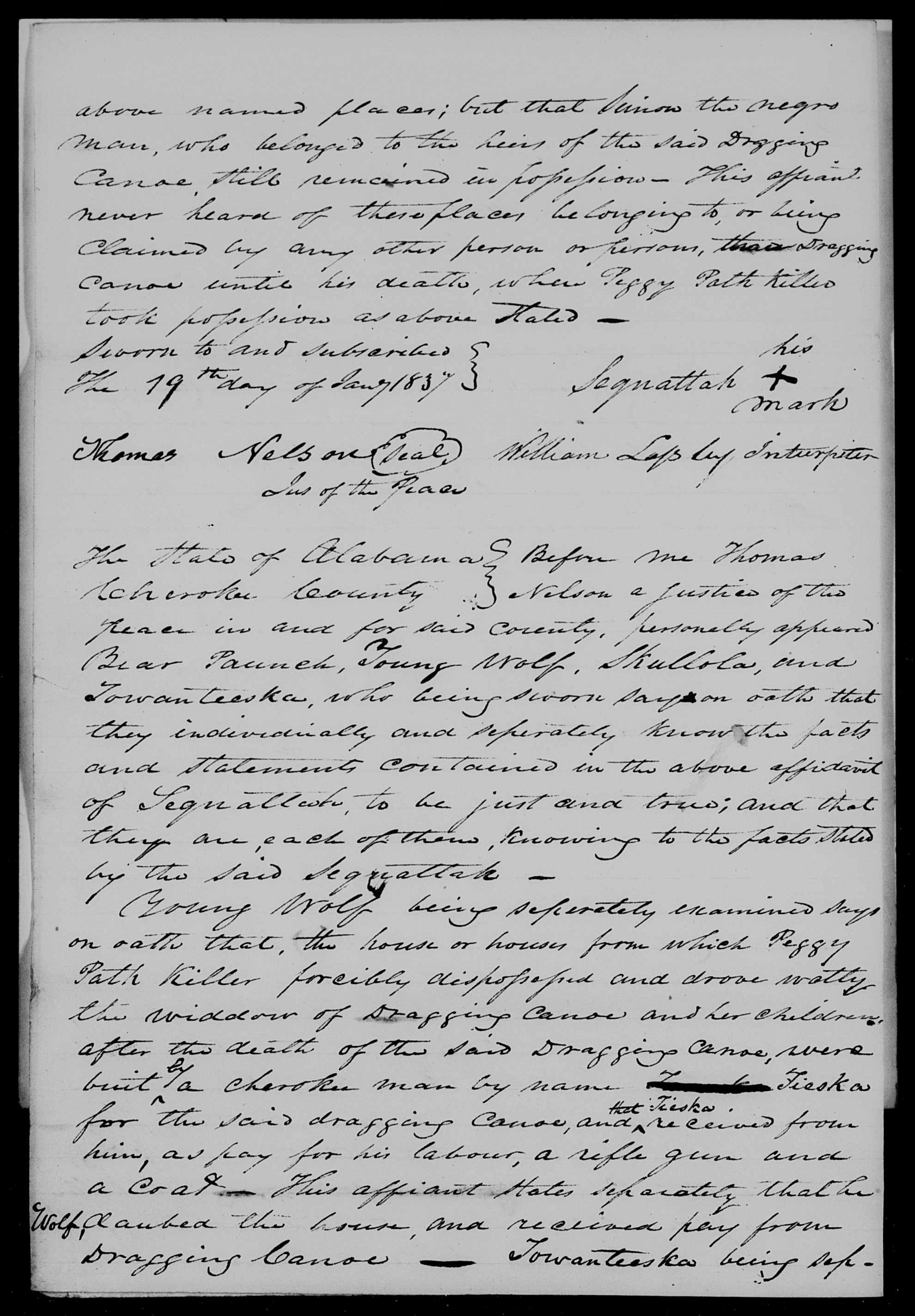 David Gage became involved with Chief Pathkiller’s family. Dragging Canoe, Chief Pathkiller, and wife Peggy’s son died in 1833. Dragging Canoe’s son, Sky-a-too-ka, entered into a dispute with Anna, daughter of Nelly (sister of Dragging Canoe). The disagreement was about who had the right to the improvements on the East side of the Coosa River. This site is the old residence of Chief Pathkiller. This is at today’s Fitts Ferry on the east side of the river, known as Alford’s Bend. This is in present-day Etowah County, north of Gadsden. This area became Peggy’s when Chief Pathkiller move north and took a new wife. He created the new improvements, which are the Garrett farm in Centre, Alabama. At the time of the dispute, Dragging Canoe, Chief Pathkiller, and Peggy were deceased. When Peggy died, she left it to Nelly. Nelly gifted it to Anna, who is married to Frances Hampton. Sky-a-too-ka is claiming this for himself, his mother, Watty, and his sister, Martha.