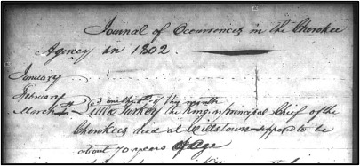 Little Turkey made his statement at the Nation’s Council meeting in October 1800. The Moravian missionaries Steiner and Schweintz were invited to attend. They recorded the meeting in their journal. This Council meeting was held at Estanaula (Oostanaula). This statement by Little Turkey was made at the close of the meeting. This was the time when the Council allowed a mission school to be built. The school was established at James Vann’s and (John) McDonald’s property. Mr. Vann had just donated property on his place. Spring Place, North West Georgia.