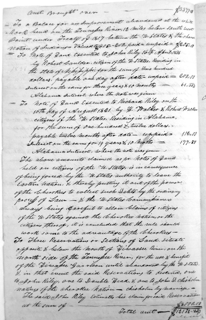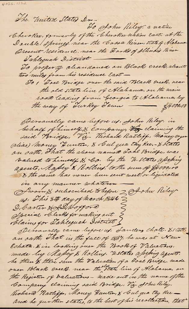 - 1842 Tahlequah District Claim #193 of John Riley dated March 8, 1842, John Ross Collection, Folder #962, The Thomas Gilcrease Institute of American History and Art (a/k/a Gilcrease Museum), Tulsa OK. ↩︎