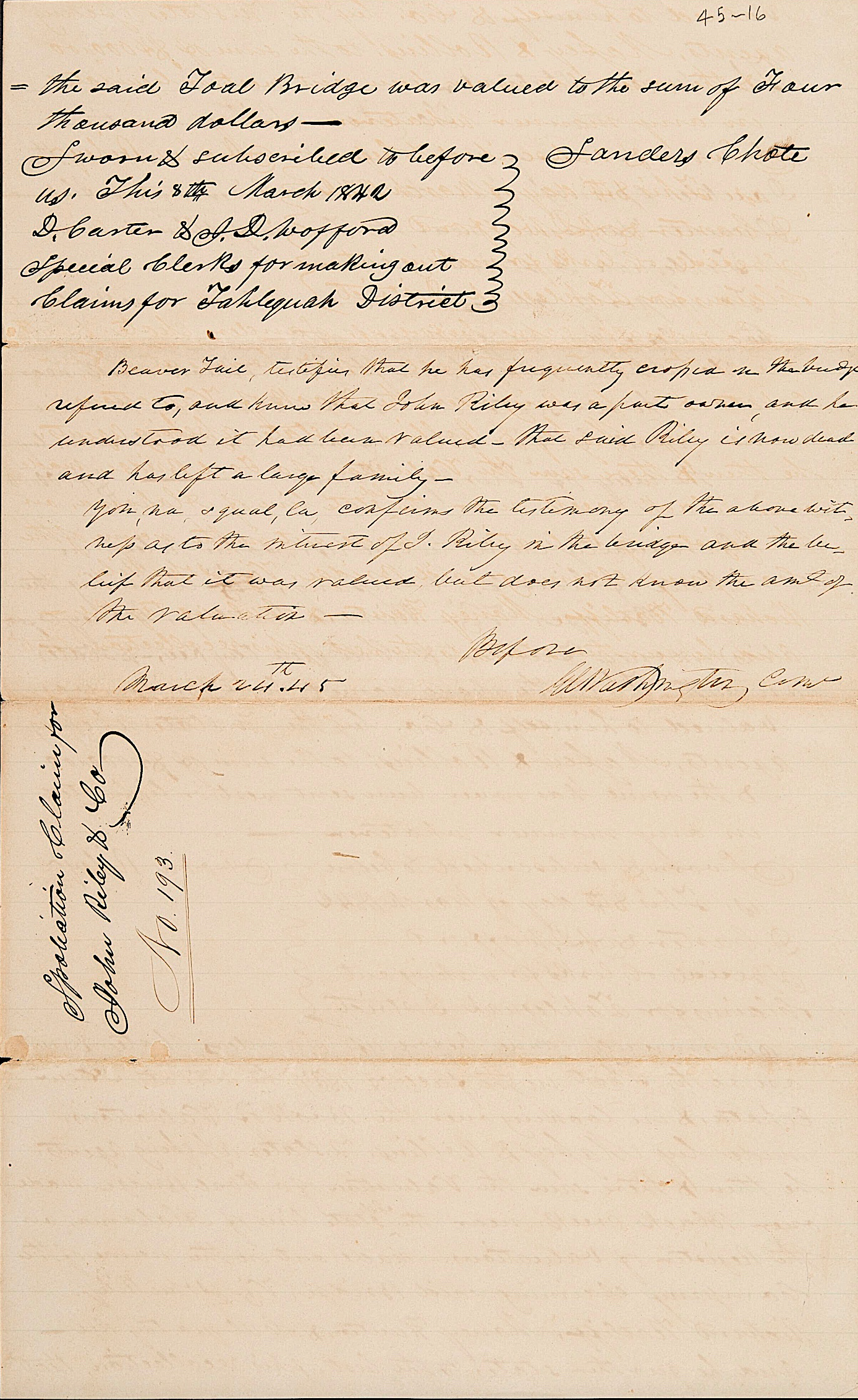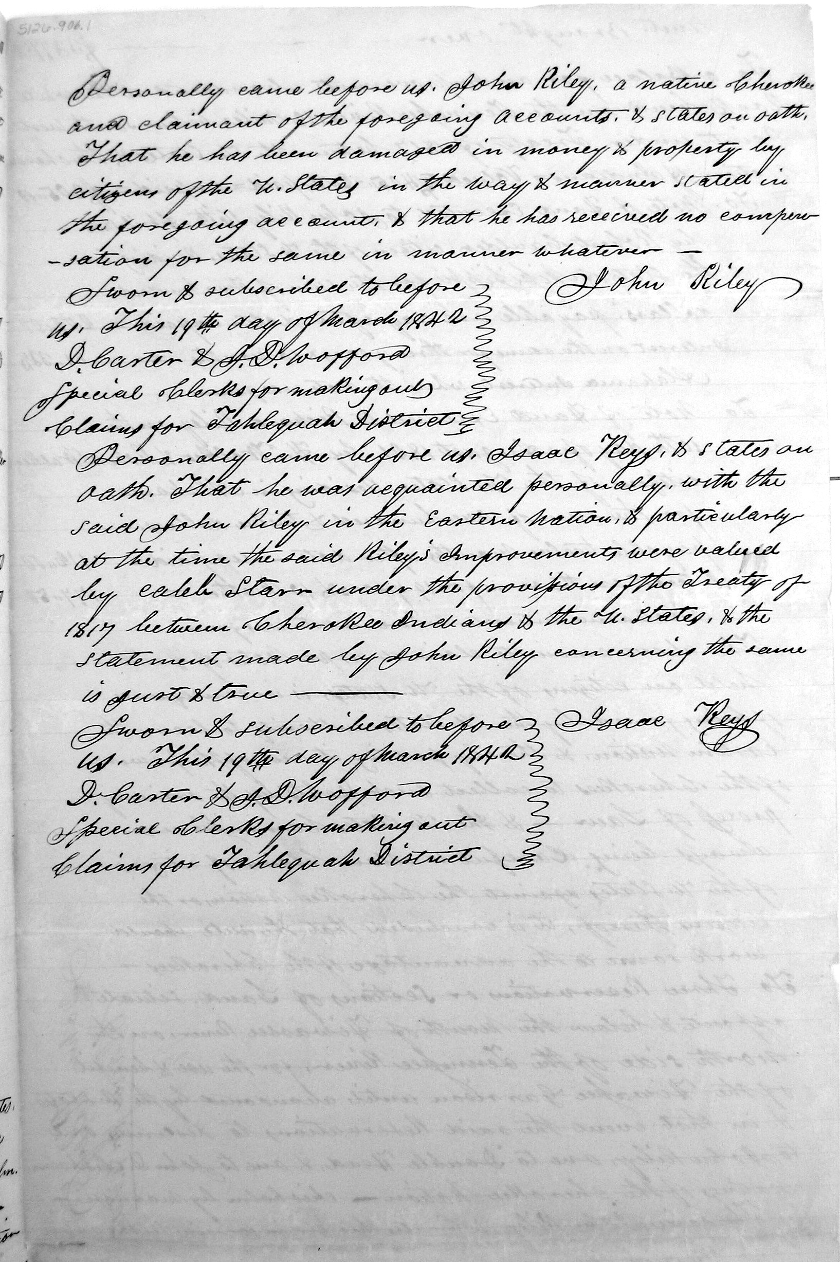 - 1842 Tahlequah District Claim #193 of John Riley dated March 8, 1842, John Ross Collection, Folder #962, The Thomas Gilcrease Institute of American History and Art (a/k/a Gilcrease Museum), Tulsa OK. ↩︎