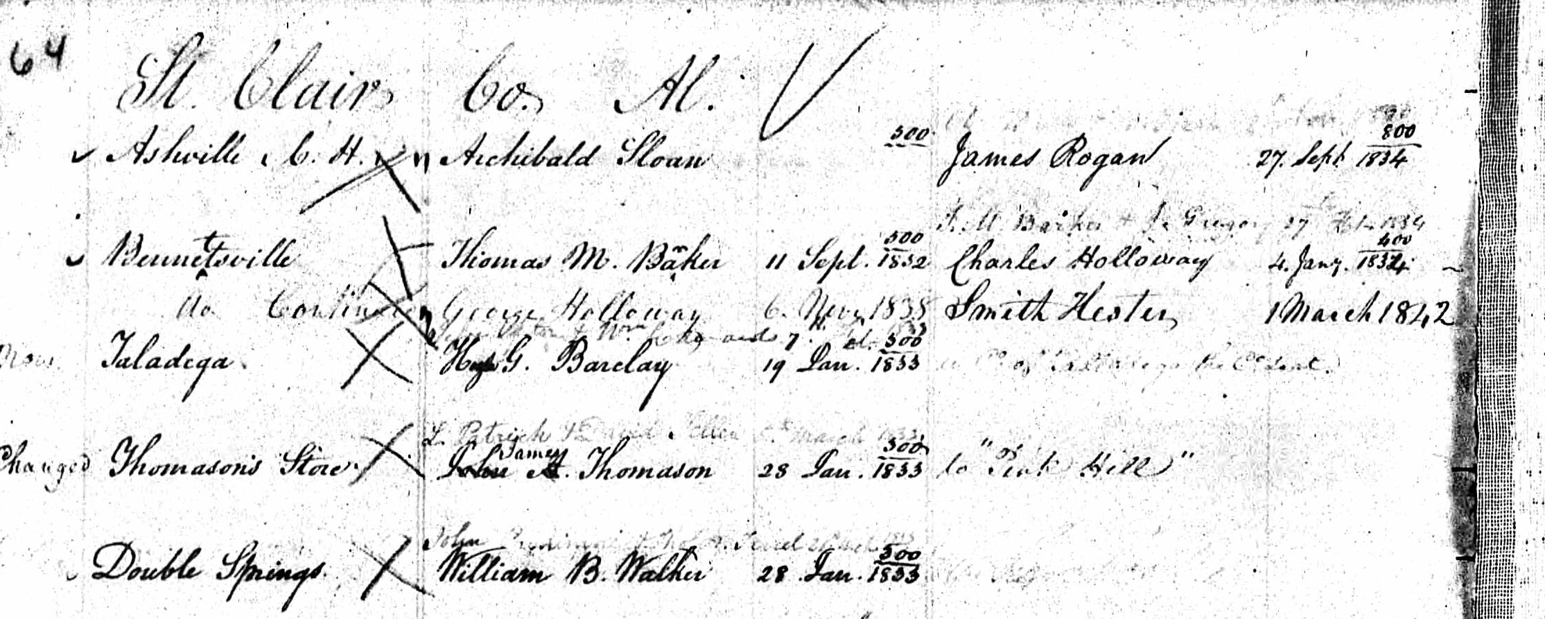 - Appointments of U.S. Postmasters 1832-1971, Volume 11 ca. 1832-44, Saint Clair County, Alabama, Ancestry.com ↩︎