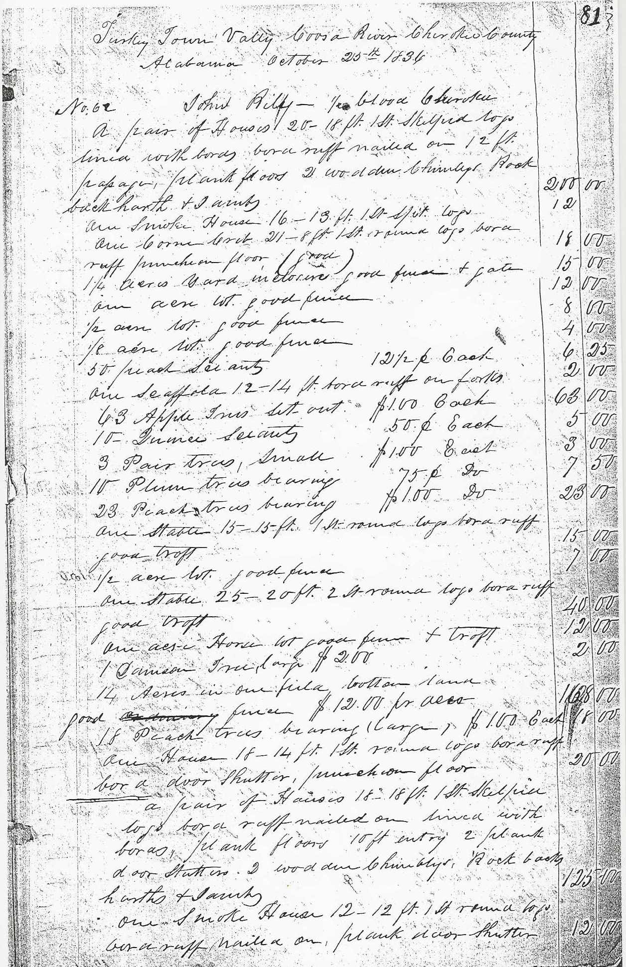 You can click on the images to make them larger. If you can read cursive writing, they are easy to read. You may have to look up some of the terms. “Puncheon” is a method for flooring made from a log shaved flat by an adze. The stand is one of the houses on one of John Riley’s three farms. These farms stretched from Black Creek to the Coosa River and onto the East side of the river. A line separates the farms listed in the claim.