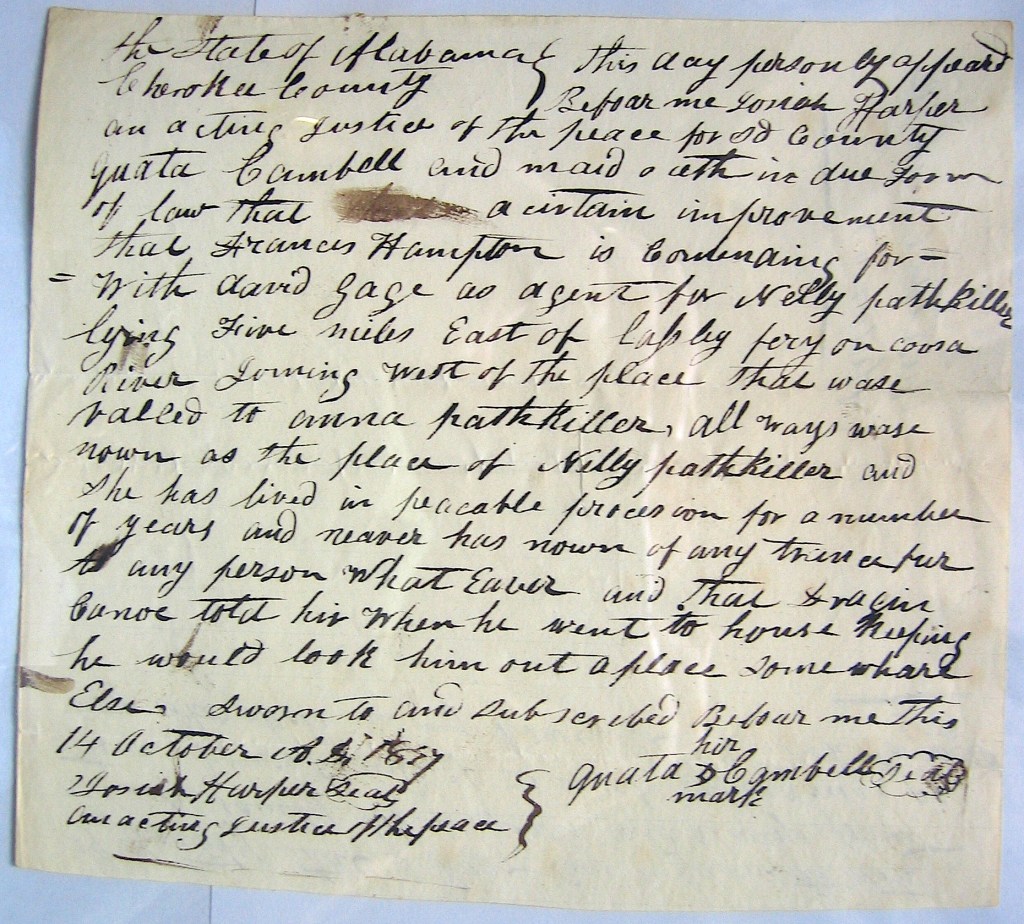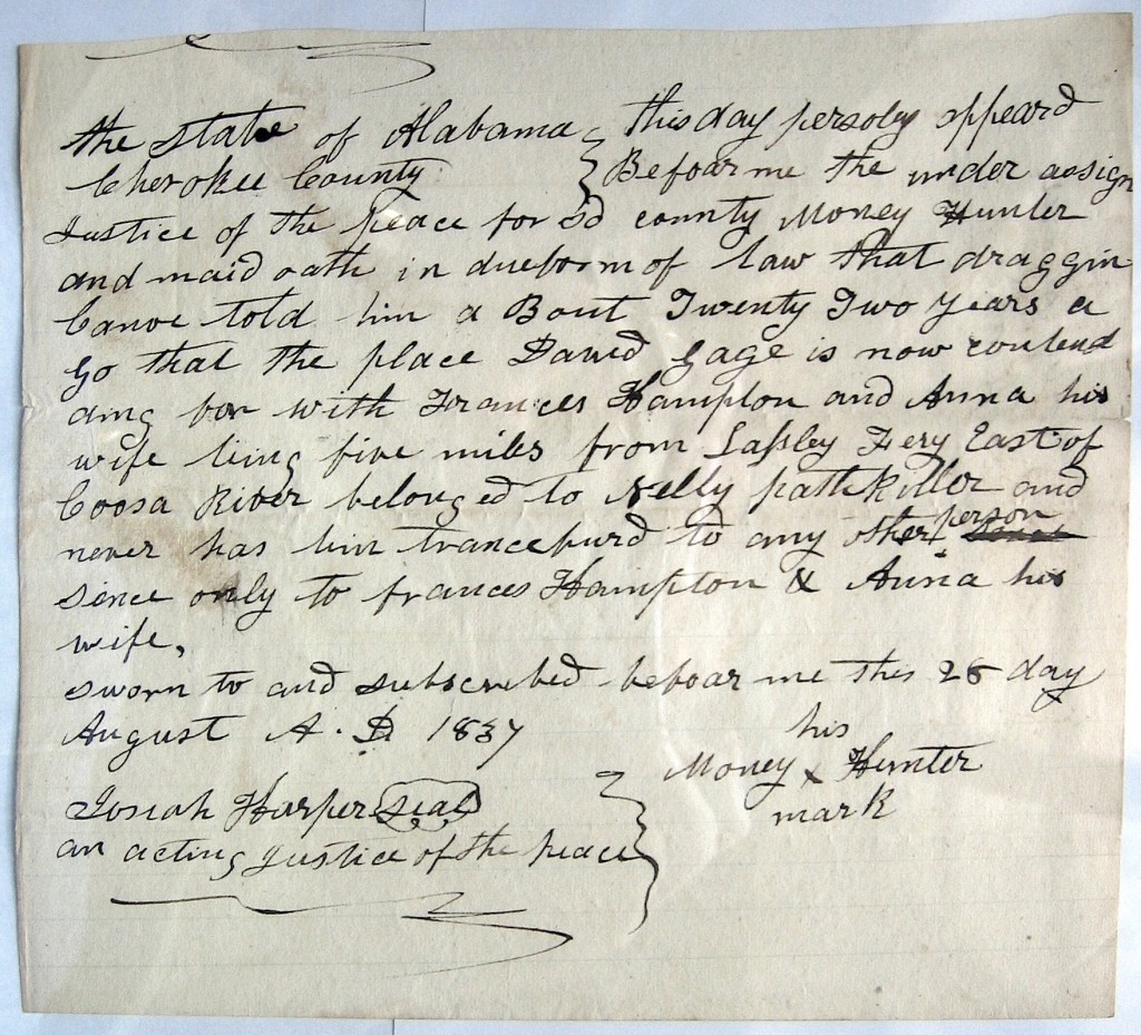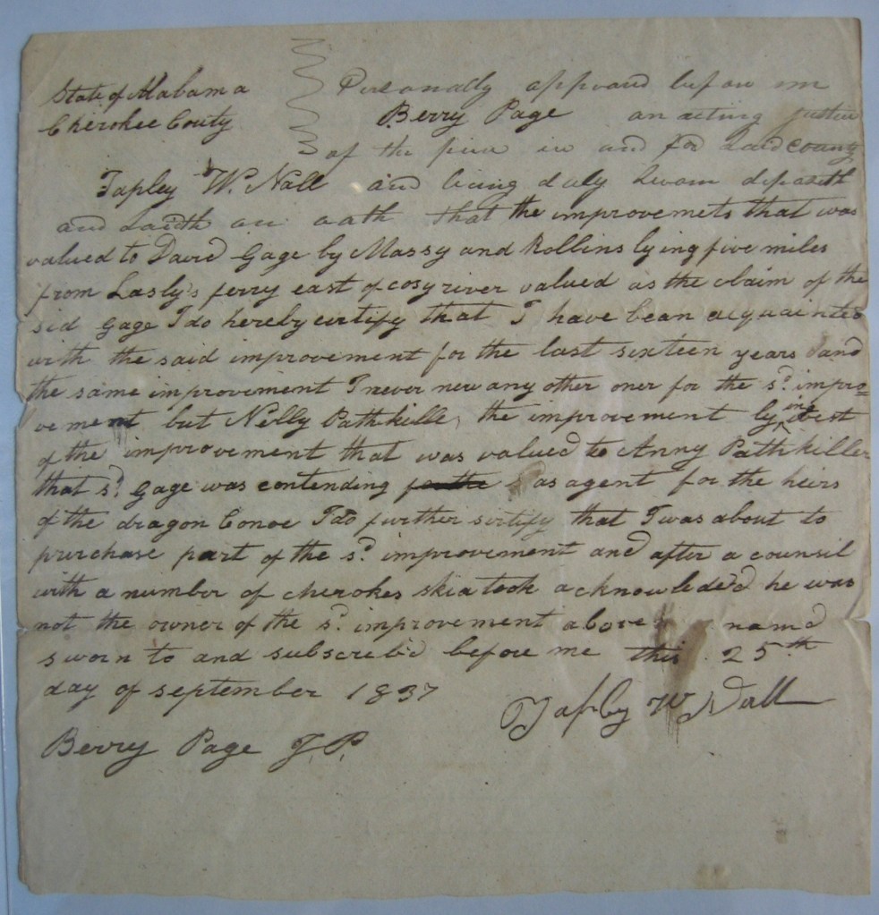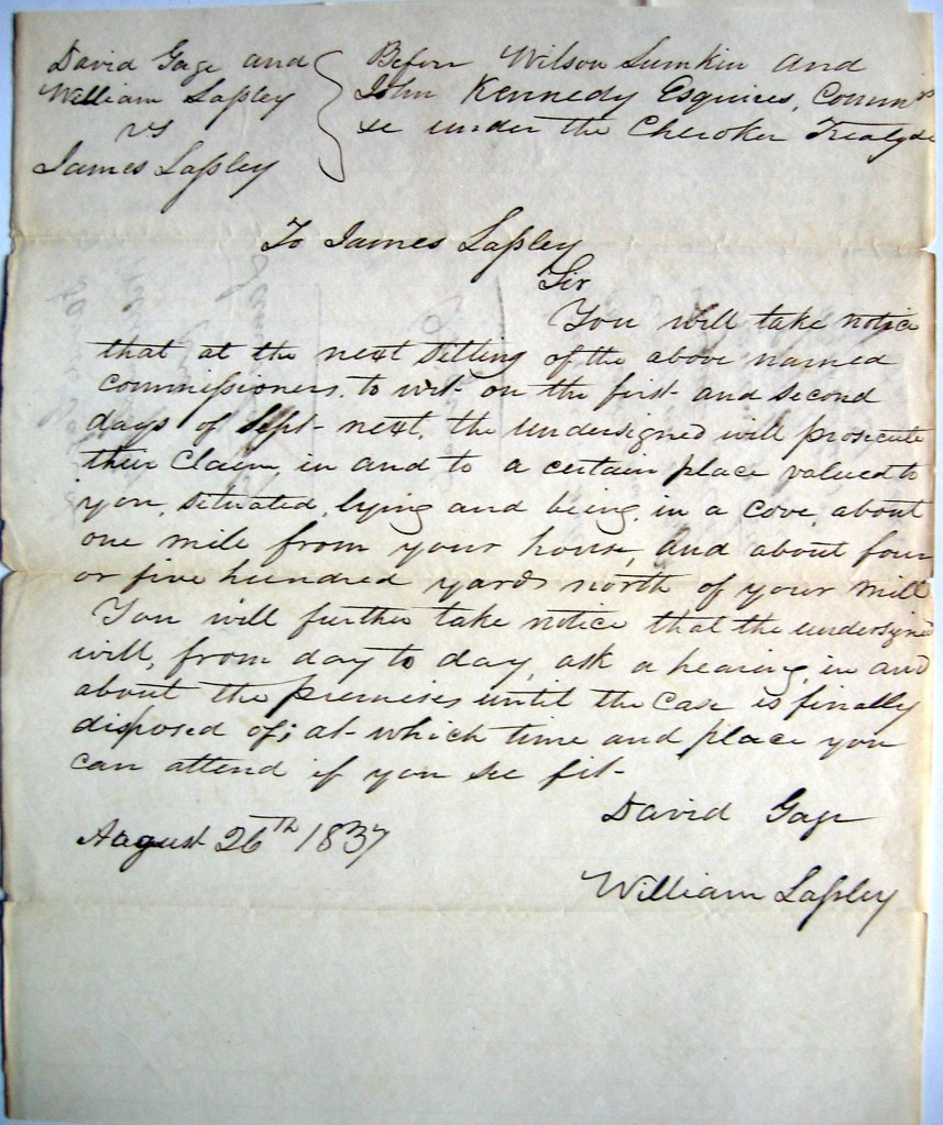 John Ridge, with this group, held 3/8 interest of Chief Pathkiller’s estate. This included the ferry, house and orchards at what is today’s Centre, Alabama. Review Chief Pathkiller’s ferries in this blog. John Ridge was the National Council’s Clerk (Secretary). William Lassley is the son of James Lasley. He is mentioned in the posts on James Lasley.