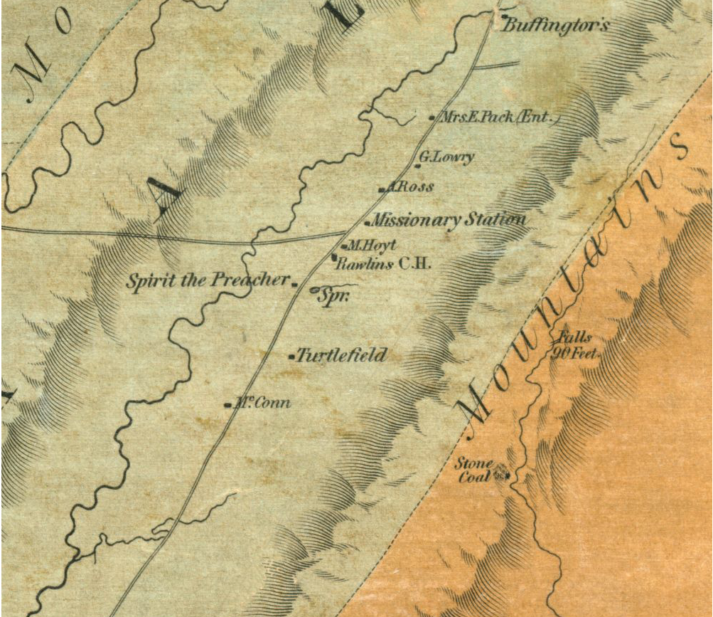 A portion of; An Accurate Map of the State of Alabama and West Florida [Sheet 2: Cherokee, DeKalb, Jackson] LaTourrette, John 1837. Notice the “Spirit the Preacher” (John Huss), and the spring next to him. This is the site of Fort Payne stockade. The “mission station” is Will’s Town Mission.2