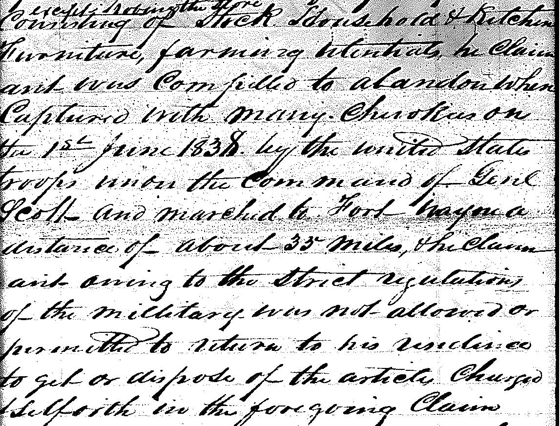 Conmincing of stock household and kitchen furniture, farming utensils, he claimant was compelled to abandon when captured with many Cherokee on the 1st June 1838 by the United States troops under the command of Genl Scott and marched to Fort Payne a distance of about 35 miles, the claimant owing to the strict regulations of the millitary was not allowed or permitted to return to his residence to get or dispose of the articles charged set forth in the forgoing claim.