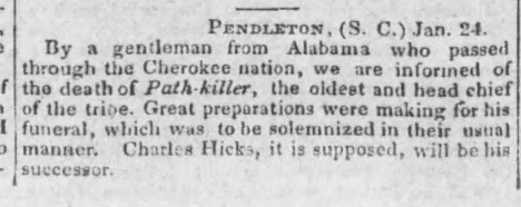 The first notable person is Charles. He is the nephew of Chief Pathkiller. The notable part of this is whether justice was served or not. Is the complaint below by Chief Pathkiller about Charles? The clip is from the journal of Rev. Daniel Butrick. He visited Turkey’s Town in January 1822. Charles is Chief Pathkiller’s nephew. Chief Pathkiller’s complaint is about his son. The time frame is perfect. Charles was murdered in April of 1821. In the culture of the Cherokee people, for the male, your sister’s children become yours on her death.