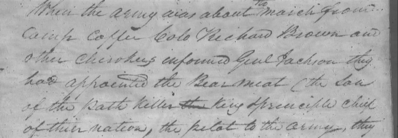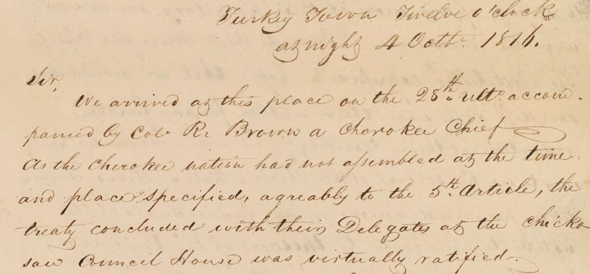 I will inform you-I see white people every day of all sorts and I treat them with Justice-Since the war we was friendly and I expected we would have mutual friendship, but now they have killed one my people-my nephew charles you must inform our agent, our agent was just where he is to do justice ask him for the murder when our beloved men put him in that place we were To do justic between each other he ought not refused to get the murder because we are less than they are-when any axident happens of that kind they mainly appehanded us whether it is just or not-my nephew was passing in the white country peacible when he was killed-Mr hicks friend I want you To procide in this as you know what to do in this case-if there should be any mistake in this I want you To regulate this and send it on To the agent. this murder was done on the Bigla near the Choctaw Nation we was informed by a man named Meconnal he was there when charldes was killed the man that killed charles by the name of Morris-when you get answer from Col. Meigs I want you to send it on as soon posble my mind is very much disturb when I hear from you mind will be easy-