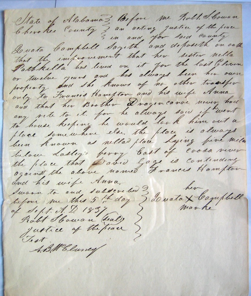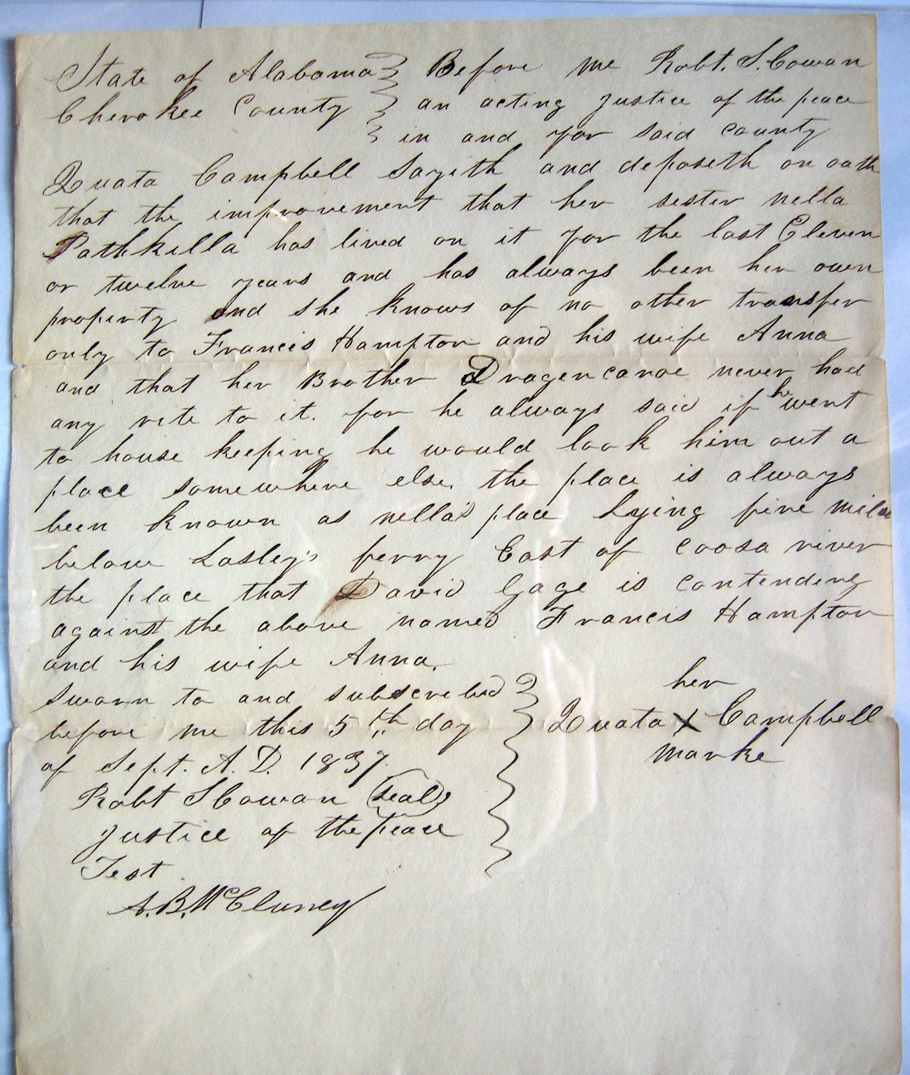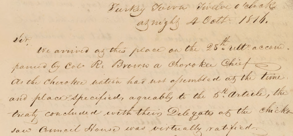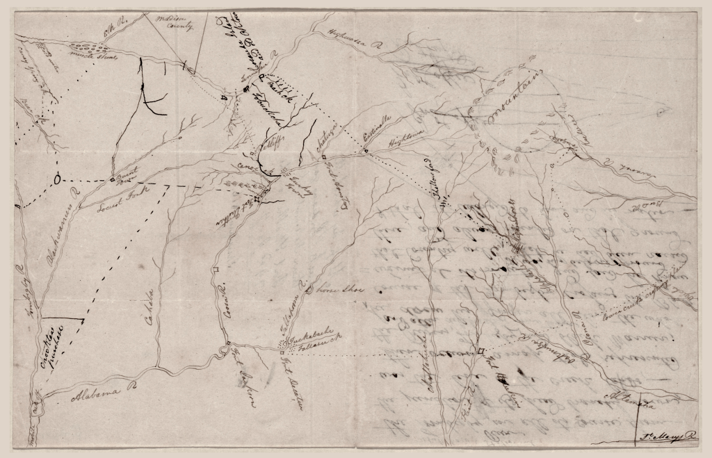 James Meigs is Return Jonathan Meigs, the Cherokee Indian Agent. His name was misspelled or misunderstood. Ezekiel Nash is an attorney. John Halbert is the newly appointed Justice of the Peace for the newly formed District V, Monroe County, Mississippi. Monroe County was created from Marion County, Alabama, when the new state line was drawn for Mississippi and Alabama in 1820-1821.3 This is on the Tombigbee River west of the Alabama state line. Benjamin Pollard is a white man living in Turkey’s Town. It is from his and his family’s name for Pollard’s Bend in Cherokee County, Alabama.