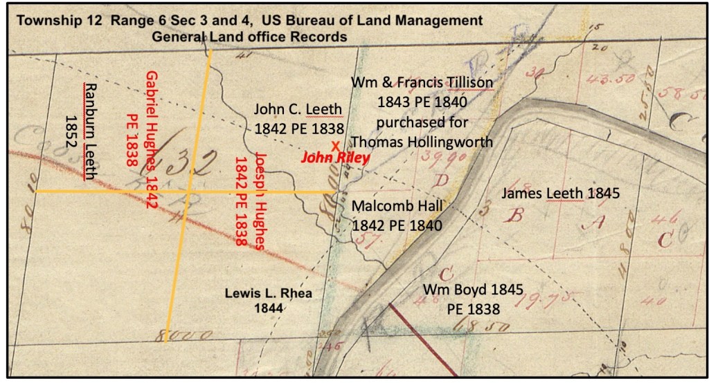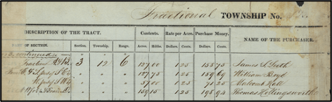 9. 86. Bureau of Land Management, General Land Office Records, Eastern States Office, Springfield, VA. Pre-emption Certificate #6,072 for James S. Leeth of Cherokee County Alabama issued May 1, 1845 for fractions “A” and “B” of fractional Section 3 in Township 12 of Range 6 East. Pre-emption Certificate #6,359 for William Boyd of Benton County Alabama issued May 1, 1846 for fraction “C” and the south part of the southeast quarter of fractional Section 3 of Township 12 in Range 6. Pre-emption Certificate #6,811 for William Tillison and Francis M. Tillison, assignees of Thomas Hollingsworth (as tenants in common) issued June 1, 1845 for the northwest fractional quarter and the fraction “D” of fractional Section 3 in the fractional Township 12 of Range 6 East. All in the District of Lands subject to Sale at Lebanon Alabama. http://www.glorecords.blm.gov/PatentSearch/ ↩︎