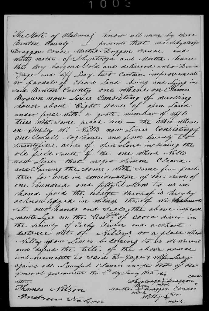 David Gage became involved with Chief Pathkiller’s family. Dragging Canoe, Chief Pathkiller, and wife Peggy’s son died in 1833. Dragging Canoe’s son, Sky-a-too-ka, entered into a dispute with Anna, daughter of Nelly (sister of Dragging Canoe). The disagreement was about who had the right to the improvements on the East side of the Coosa River. This site is the old residence of Chief Pathkiller. This is at today’s Fitts Ferry on the east side of the river, known as Alford’s Bend. This is in present-day Etowah County, north of Gadsden. This area became Peggy’s when Chief Pathkiller move north and took a new wife. He created the new improvements, which are the Garrett farm in Centre, Alabama. At the time of the dispute, Dragging Canoe, Chief Pathkiller, and Peggy were deceased. When Peggy died, she left it to Nelly. Nelly gifted it to Anna, who is married to Frances Hampton. Sky-a-too-ka is claiming this for himself, his mother, Watty, and his sister, Martha.