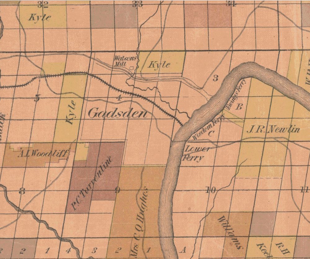 One last image of what would become Gadsden is the first map of Etowah County. Tallman drew it and it was published in 1877. The image comes from the University of Alabama’s website on Historic Maps of Etowah County, Alabama. You can see Ewing’s Ferry, the original Riley’s Ferry. You can see Wisdom’s Ferry, which is the Lafferty Landing and the ferry they created for it in 1846. Then there is the lower ferry, which is unnamed. You can see the location that is plotted out for Gadsden.