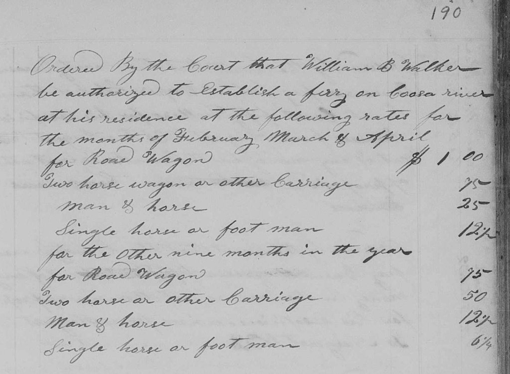 You can read the record of the ferry as Walker’s Ferry. It list the fees. This was recorded in 1832.