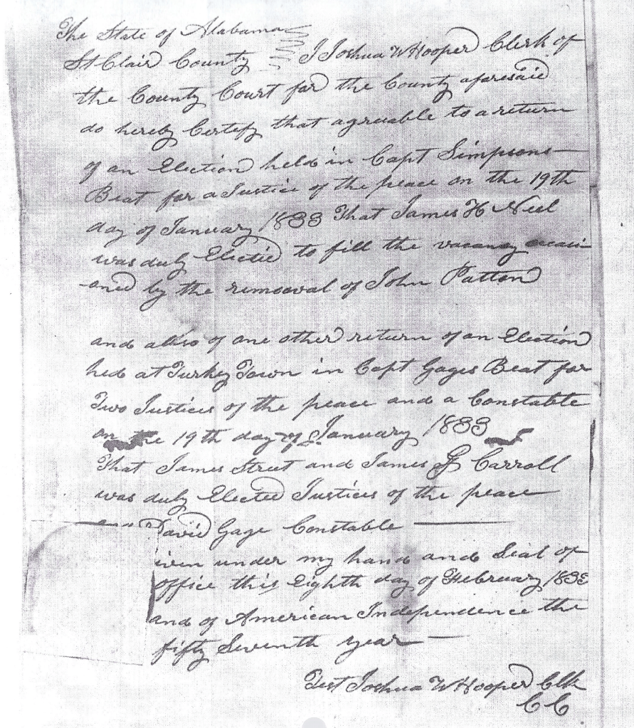 “and also of one other return of an Election held at Turkey Town in Capt Gages Beat for Two Justices of the peace and a Constable on 19th day of January 1833 That James Street and James G Carroll was duly Elected Justices of the peace. Capt David Gage Constable ———–“